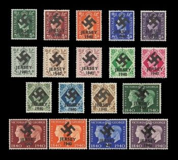 The only occupation overprints to survive are one or two sets of the Jersey stamps, held in private collections. Any Jersey or Channel Islands occupation overprints for sale today are reproductions or forgeries.