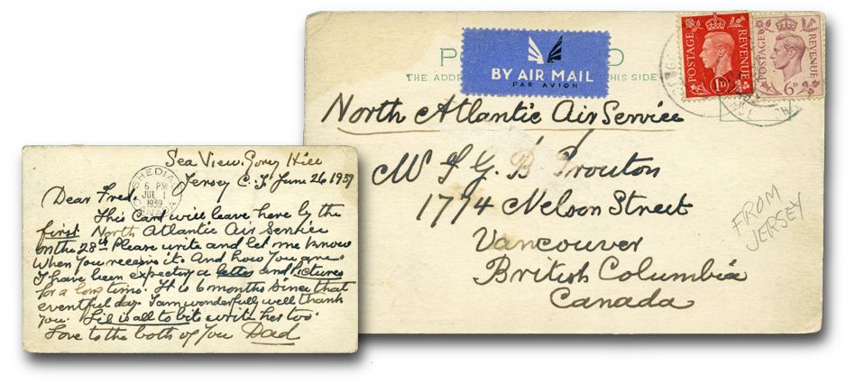 Used envelopes (called “covers” by philatelists)1 and postcards bearing British stamps and posted from Jersey and Guernsey are common; the postcard shown below, franked with two British stamps, was posted from Jersey in 1939.