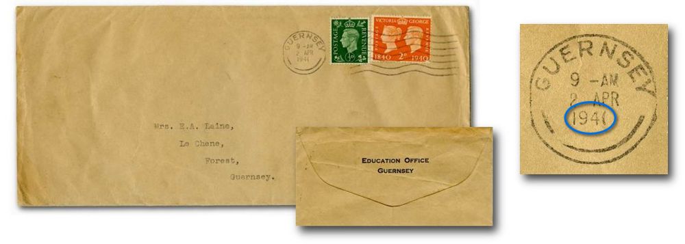 One result of this particular shortage is shown in the Guernsey cover below; note that the “1” of “41” in the circular portion of the cancellation is curved. The explanation? Because the post office did not have moveable metal type representing the numeral 1 for the new year, 1941, and could not order new type from Great Britain, a postal clerk improvised by filing off the right-hand two thirds of the “0” of “1940.”
