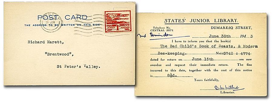 The first Jersey stamp was based on the design of the Guernsey stamp. When supplies of British postage stamps ran out on Jersey, the Bailiff of Jersey asked Col. Rybot to submit designs for penny and halfpenny stamps. Working from a photograph of the original Guernsey stamp design,2 (which hadn’t yet been issued) and following instructions that the stamps were not to bear the portrait of King George VI or any symbol connecting Jersey with Great Britain (the same instructions that were issued in Guernsey), Rybot produced two trial designs, which were refined to more closely reflect the Medieval style of the original Jersey Arms. German intelligence officers passed the designs for printing.