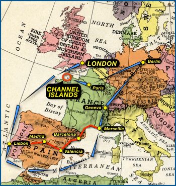 The Red Cross messages were conveyed to and from the Channel Islands on a convoluted route that involved several segments (shown in the map at the right):