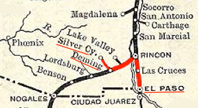 Following its journey by air, the cover was transferred to a train going north from El Paso to Rincon, New Mexico, then to a train going west to Deming, New Mexico, and finally to another train heading northwest to the Atchison, Topeka & Santa Fe Railway depot in Silver City. The image at the right shows the railway route (in red).