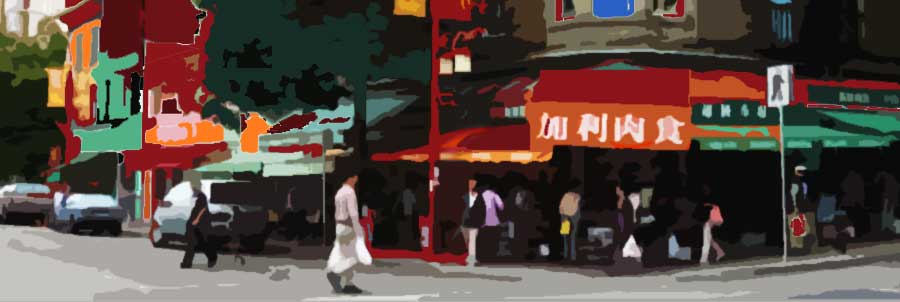 A scene in Vancouver’s Chinatown, at the corner of Gore Avenue and East Georgia Street, based on the author’s original photograph taken in 2008.