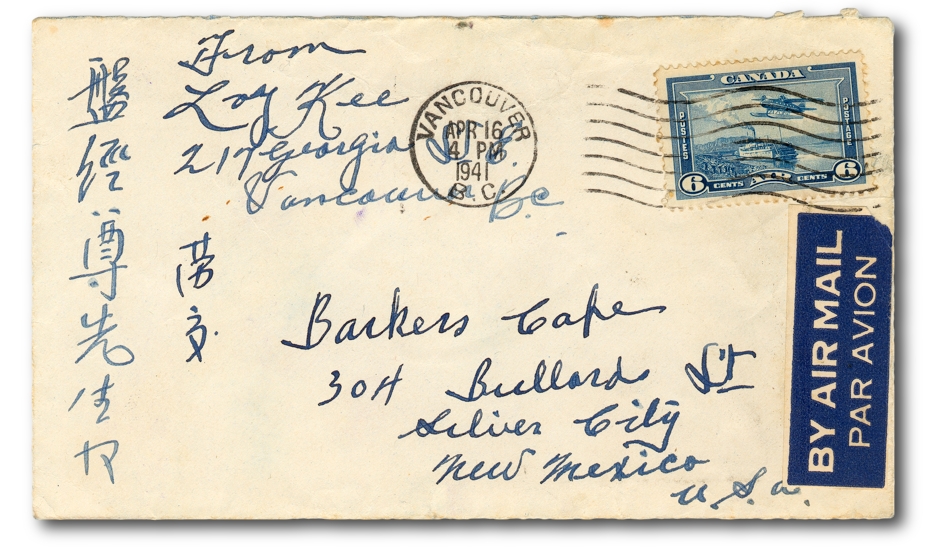 The cover to Silver City was postmarked April 16, 1941. Loy Kee paid for airmail service, affixing a 1938 airmail stamp to it. The stamp, issued June 15, 1938, shows a Fairchild Sekani floatplane flying over the stern-wheel riverboat S.S. Distributor on British Columbia’s Mackenzie River.
