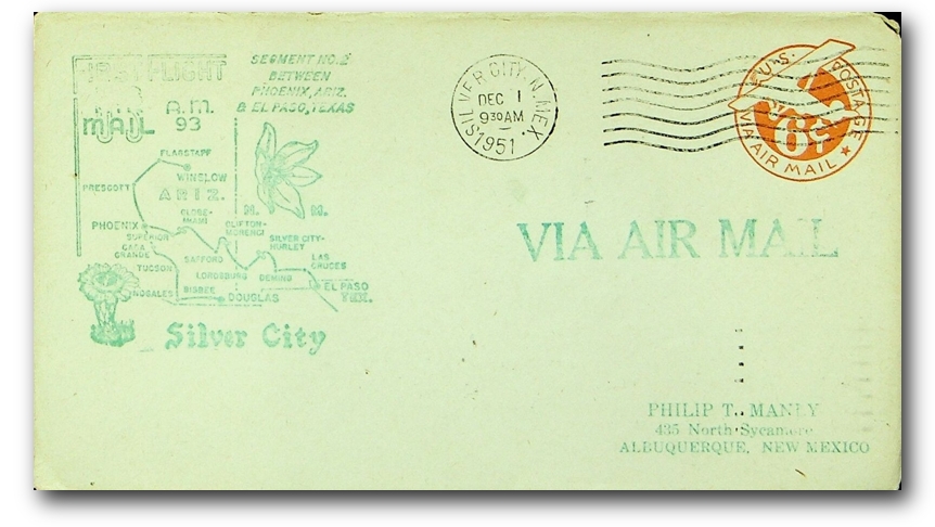 Kee Loy’s airmail cover couldn’t have been flown all the way to Silver City. Because there was no airmail service between Vancouver and Seattle in 1941, the first leg of its trip probably would have been by rail. And Silver City, at the other end of the route, would not have airmail service until 1951 when the Silver City-Grant County Airport opened, as illustrated by this First Flight Cover (FFC):1