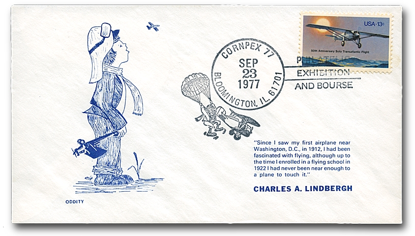 I personally have great respect for Lindbergh, despite his questionable wartime activities. And I’m not alone. For the philatelic exhibition Cornplex 77, in Bloomington, Illinois, philatelist Tom Geiger, a member of the on-line stamp club StampoRama, created this event cover: