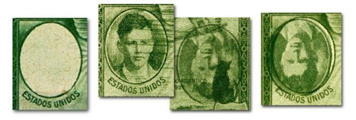 The illustration below compares the original bright-green stamp with various dull-green examples of reprints exhibiting some of those varieties: