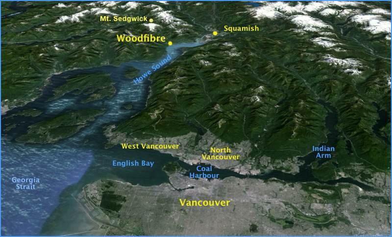 Like other resource-based communities in B.C., Woodfibre was isolated by geography. The nearest community, Squamish, eight km east-northeast of Woodfibre at the head of Howe Sound, was accessible only by water. Vancouver lies 48 km to the south.